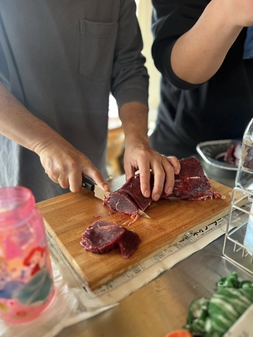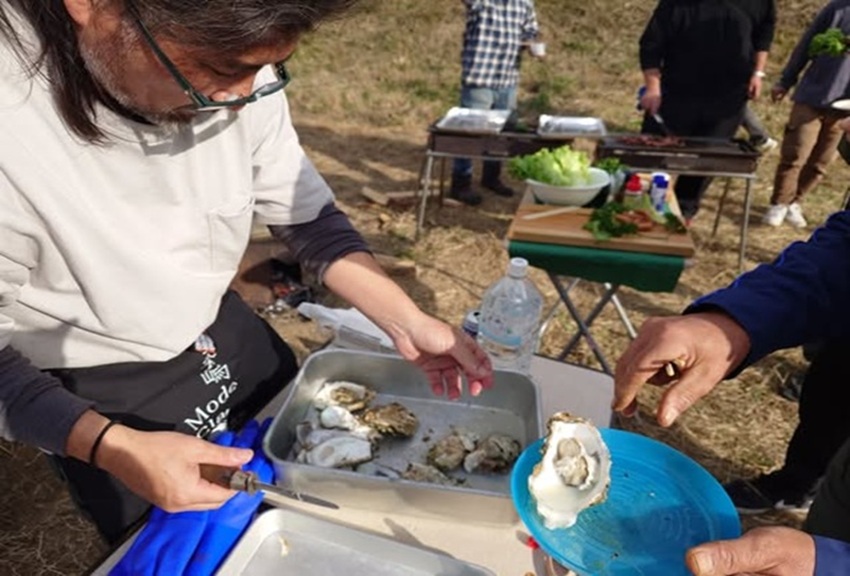晴天の下、360°見渡す限りの緑の中でいただく野菜や牡蠣などの海鮮からなんと鹿肉まで!